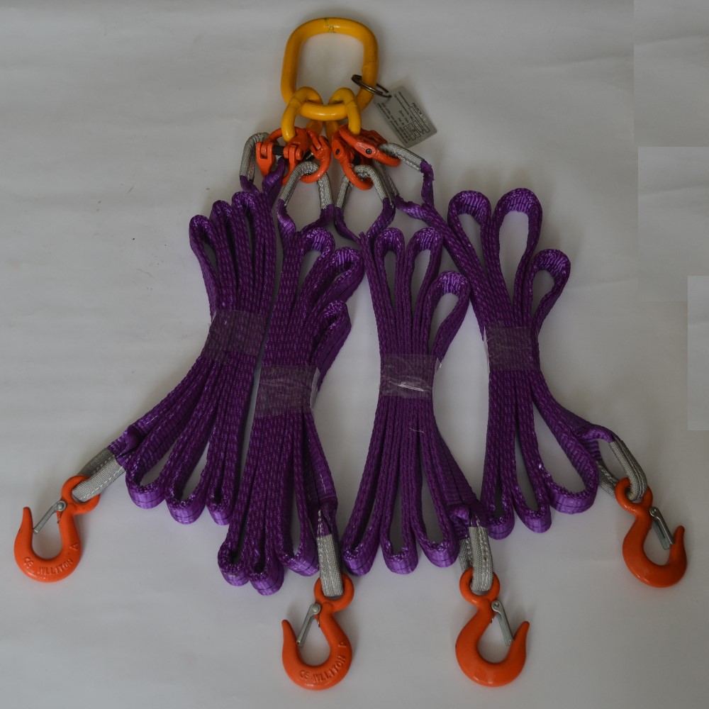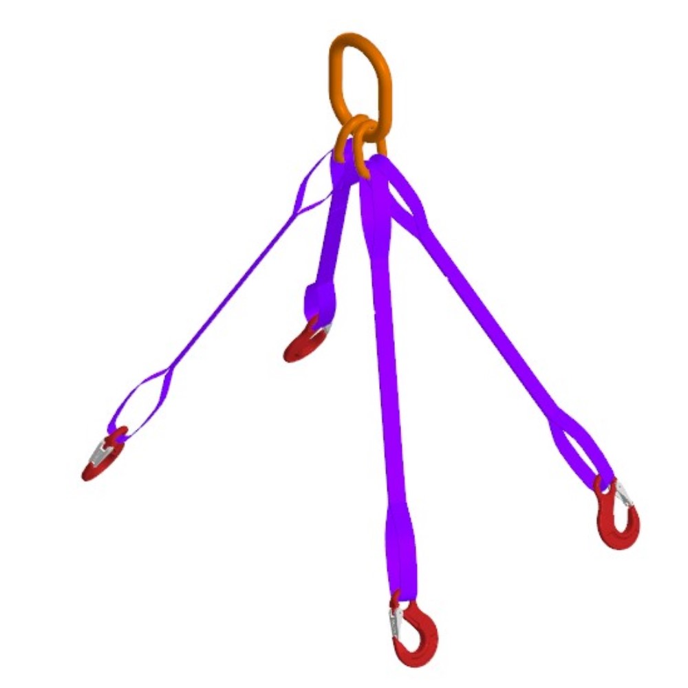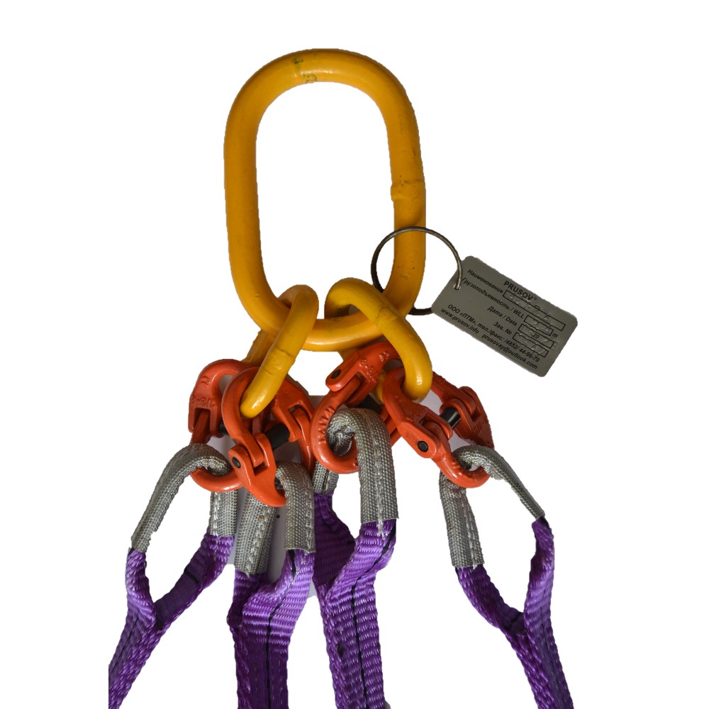Комплектующие стропа - верхнее овальное звено, синтетическая лента и грузоподъемные крюки - подобраны в соответствии с общей грузоподъемность самого стропа. Цветовая гамма ленты многоветвевых стропов значения не имеет.